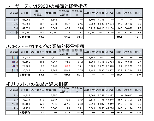 上の図は、レーザーテック・JCRファーマ・ギガフォトンの直近の業績、直近3期分の経営指標を比較のために並べた表です。