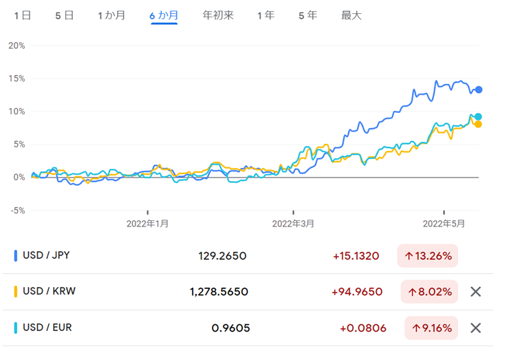 最近、ここ3カ月間ぐらいのドル高は、↓の画像に示した通り、円、ウォン、ユーロの対ドル相場のチャートのように、ほとんどすべての通貨に対して、ドルが高くなっています。対円では比較的大きなドル高となっていますが。