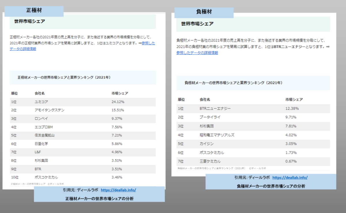 なお、ディールラボでは、セパレーターでは生産規模でシェアを、正極材・負極材・電解液では売上高を利用してシェアを試算しています。