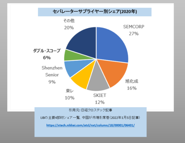 上記の記事で、 1強(SEMCORP)と強みをもつ複数の企業というタイトルで中国のセパレーター企業を紹介する記事です。