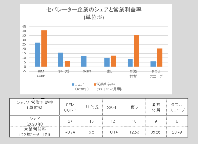 シェア(青色の棒)が低い星源材質やダブルスコープが、シェアが高い旭化成やSKEITより、営業利益率が高く、セパレーター全体のシェアと営業利益率は関係がないことがわかります。